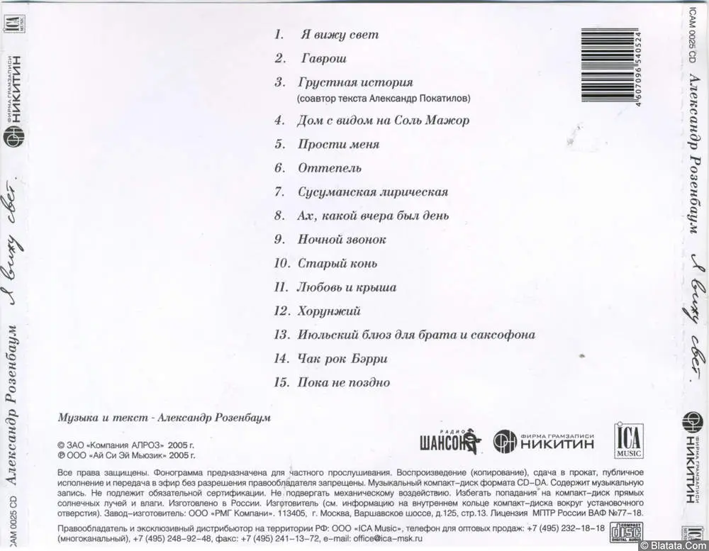 Альбом «Я вижу свет», выпущенный в 2005 году, представляет собой одно из значимых произведений Александра Розенбаума, в котором сочетаются характерные для него элементы шансона и авторской песни. Слушая этот альбом, можно заметить, как мастерски Розенбаум передает разнообразные эмоции и жизненные ситуации, рассказывая истории, знакомые каждому из нас. Заглавная композиция «Я вижу свет» задает позитивный настрой и предлагает слушателю надежду на лучшее.