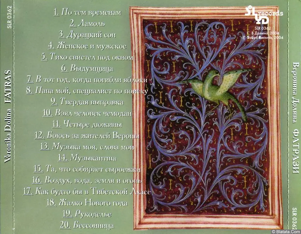 Альбом «Фатрази» Вероники Долиной, выпущенный в 2004 году, представляет собой яркое и многослойное произведение, которое продолжает традицию авторской песни, сочетая иронию, философию и яркие образы. Этот альбом погружает слушателя в мир абсурда, загадочности и глубоких размышлений о жизни, отношениях и времени.