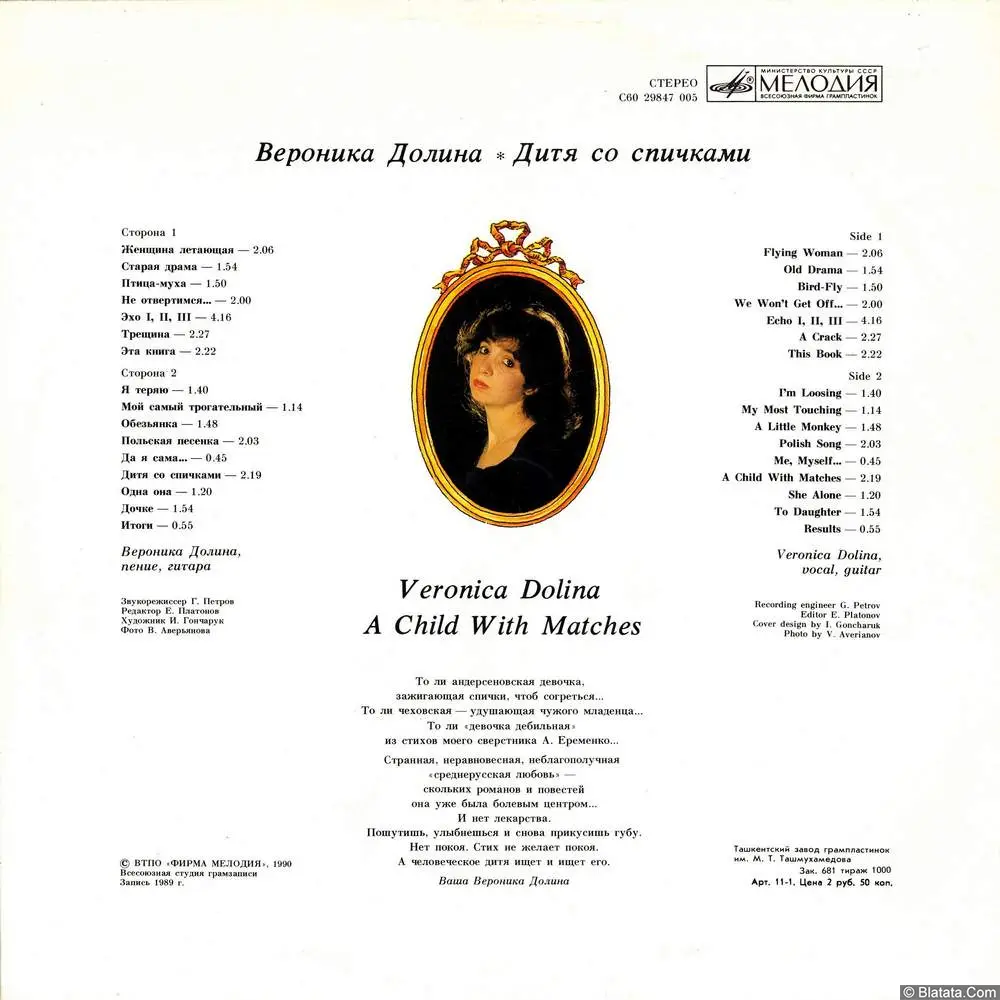 Альбом «Дитя со спичками» (1990) — это глубокая и трогательная работа, пропитанная размышлениями о жизни, людских судьбах и чувствах. Название отсылает к сказке Ганса Христиана Андерсена и символизирует хрупкость человеческой души, борьбу за тепло и свет в мире, полном холодной реальности. Вероника Долина в этом альбоме раскрывается как поэт, философ и рассказчик, способный превратить каждую песню в миниатюрную притчу или исповедь.