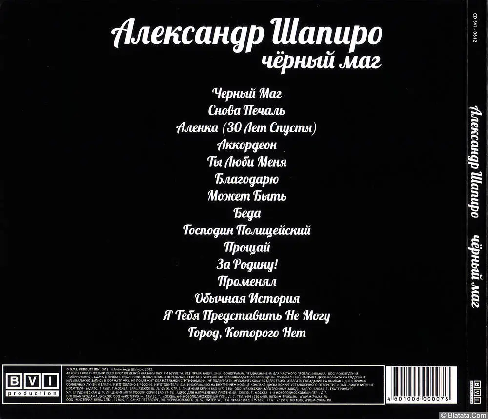 Альбом Александра Шапиро «Чёрный маг» (2012) — это яркое продолжение его музыкального пути, где автор снова смешивает традиции русского шансона с более личными и глубокомысленными темами. В каждой песне слышен фирменный стиль Шапиро, сочиняющего мелодии с элементами фольклора и живыми, проникновенными текстами, наполненными эмоциями и философией. Композиции на альбоме разные по настроению, но все они искренни и отражают внутренний мир исполнителя.