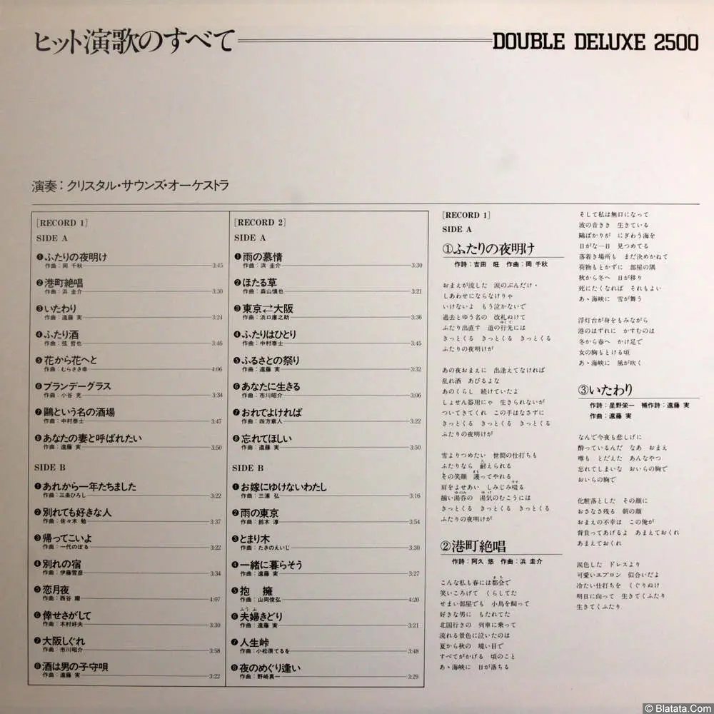 Двойной виниловый альбом из престижной серии Double Deluxe 2500, объединяющий расширенную подборку популярных песен жанра enka в оркестровых, инструментальных версиях. Записи выполнены студийным коллективом Crystal Sounds Orchestra с акцентом на выразительную мелодию, чёткую ритмику и «чистый» баланс — формат, удобный как для караоке, так и для спокойного домашнего прослушивания.