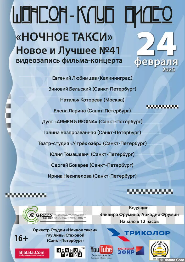 24 февраля 2025 года в Санкт-Петербурге Студия «Ночное такси» производит съемку фильма-концерта «Ночное такси» — новое и лучшее» №41. Фильм популярной тематики The best Студия записывает c 2011г., проект был придуман продюсером Александром Фруминым для премьерных показов, демонстрации лучших песен, как уже известных, так и новых артистов. Студия «Ночное такси» имеет многомиллионную зрительскую аудиторию, что подтверждают счетчики просмотров наших фильмов и клипов на ТВК «Ночное такси» на YouTube. Эта аудитория умножается.
