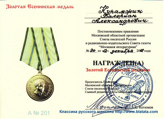 И вот пришло приятное известие – Валериан Курамжин постановлением правления Московской областной организации Союза писателей России награжден Золотой Есенинской медалью. Приятно вдвойне – во-первых, мы, действительно не ошиблись в своих оценках, пусть иногда субъективных, во-вторых – не так часто поэтов, работающих в жанре русской песни награждают и отмечают какими-либо наградами.