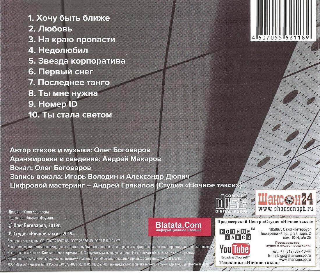 Очередная новинка от Студии «Ночное такси», которая в очередной раз подтвердила постулат Александра Фрумина – мы выпускаем очень разную русскоязычную музыку… ведь именно Студия в свое время первой издала альбом (ныне – Заслуженного артиста России) Стаса Михайлова «Свеча» и разрушила стереотип, что издает только блатняк.