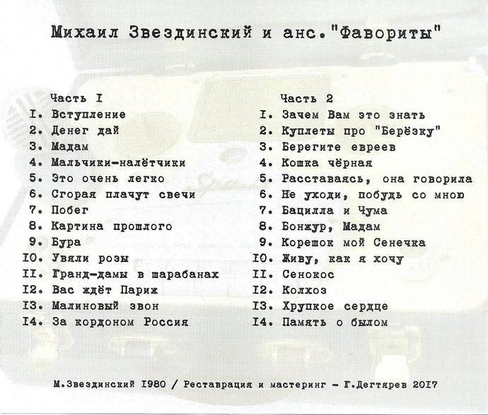 Оригинальный альбом был записан и издан Михаилом Звездинским в феврале 1980 года, как раз накануне знаменитой Олимпиады и затем маэстро отправился в места не столь отдаленные. И потом мы его услышали только в начале 1990-х годов…