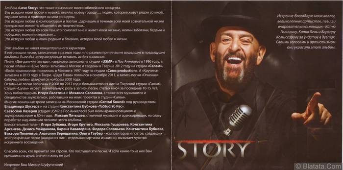 По традиции – несколько абсолютно жанровых вещей («Дядя Папа», «Не ешь с ножа»), а по большей части хорошо сыгранная и аранжированная лирика и эстрада, местами даже танцевальная, как. Например, «Огненная бабочка любви». У Михаила Шуфутинского, если так можно выразиться, есть свой собственный и определенный рецепт «приготовления» альбомов – всего понемногу и все будет хорошо. Так и с пластинкой «Love story» — каждого жанра и стиля по щепотке. Скажу честно, мне альбом понравился, только за «Дядю Пашу» уже можно все простить – все эксперименты с жанров, это песня сделана на уровне легендарного митяевского «Ночного гостя» («Песенка про ножи»). Поэтому она в ротации и в эфирах – абсолютный многолетний на перспективу хит.