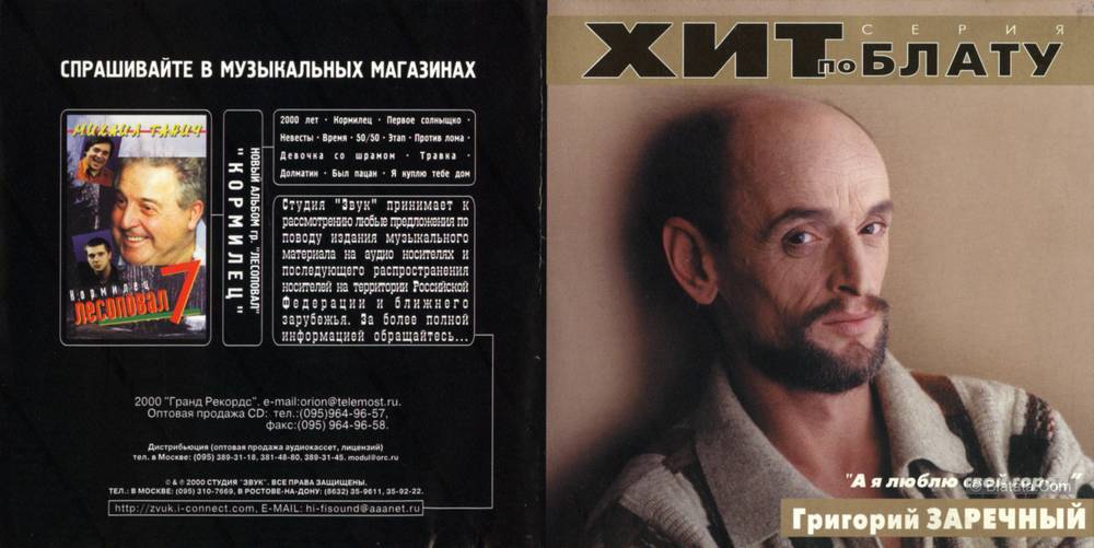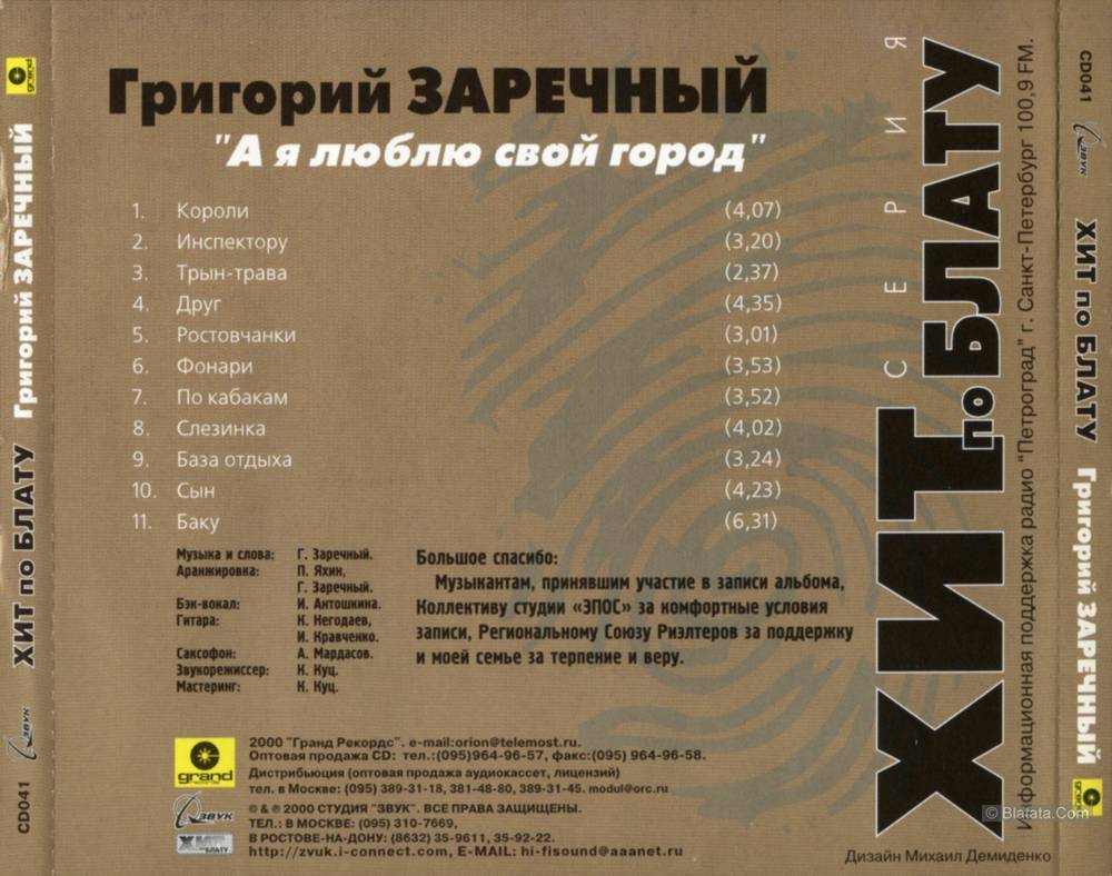 Представляем вам музыкальный альбом Григорий Заречный - А я люблю свой город (2000), выходивший в формате CD диски, а также возможно еще выйдет или выходил на других носителях. Этот релиз вышел у издателей Гранд рекордз в формате Компакт-диск. Диск отпечатан - Россия. Релиз издания - 2000 год. Работа записана в жанре поп и её можно отнести к стилям - шансон. В записи принимали участие Григорий Заречный. В целом диск выходил на следующих носителях: Вас заинтересует издание Григорий Заречный - А я люблю свой город (2000), если с интересом относитесь к следующим исполнителям - Григорий Заречный и любите произведения в стиле шансон.
