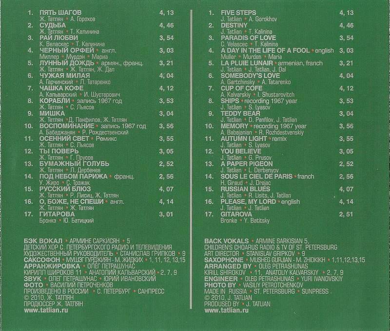 Жан Татлян проделал огромный жизненный путь, вобрал в себя наследие разных культур, как национальных, так и вокальных, но при этом остался себе – своему вокальному почерку, своей уникальной подаче каждой песни. В пластинку вошли песни на русском, английском и французском языках.
