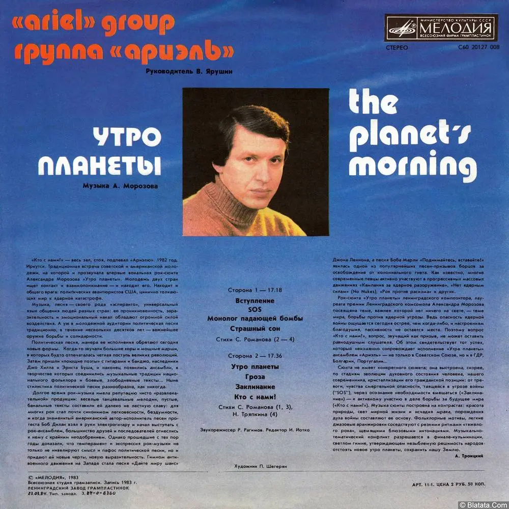 Альбом Утро планеты ВИА «Ариэль» 1983 года стал заметным событием в советской музыкальной культуре начала 80-х. Этот альбом представляет собой смелую попытку ансамбля обратиться к концептуальной музыке, в которой тесно переплетаются антивоенные и философские темы, переданные через необычное сочетание рока, прогрессивной эстрады и электронных элементов.