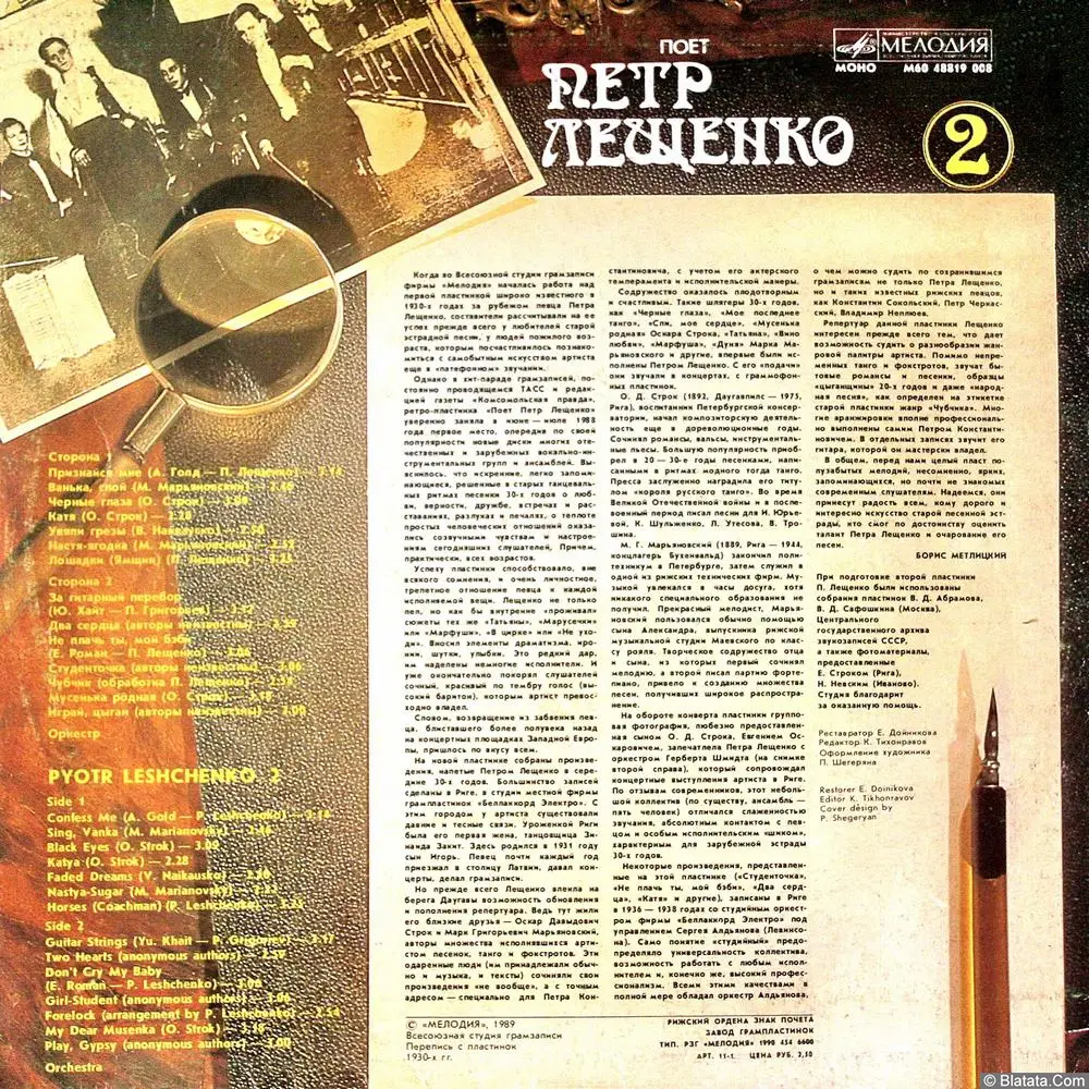 Поет Пётр Лещенко-2 — это яркий пример того, как Пётр Лещенко умел совмещать в своей музыке самые разные жанры и стили, делая их доступными и любимыми широкой аудиторией. Альбом представляет собой коллекцию песен, которые иллюстрируют его мастерство как исполнителя романса, цыганской и народной песни. Каждая композиция имеет свою уникальную атмосферу, но все они объединены искренностью и эмоциональной насыщенностью, присущей стилю Лещенко.