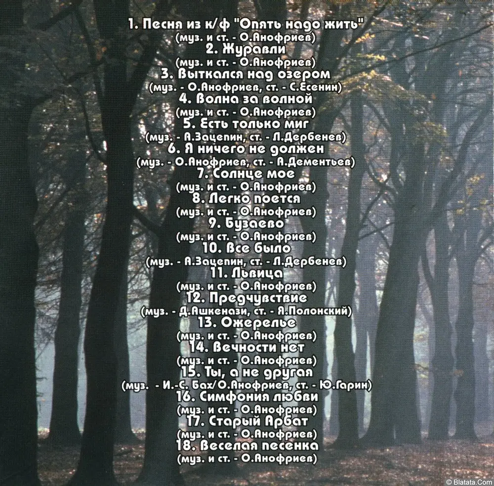 Компакт-диск Олега Анофриева «Симфония любви», выпущенный в 2000 году, является сборником песен, отражающих глубину эмоций и мастерство исполнения этого талантливого артиста. Анофриев, известный не только как певец, но и как актёр, смог собрать на этом альбоме множество произведений, которые оставляют неизгладимое впечатление благодаря своим мелодиям и текстам.