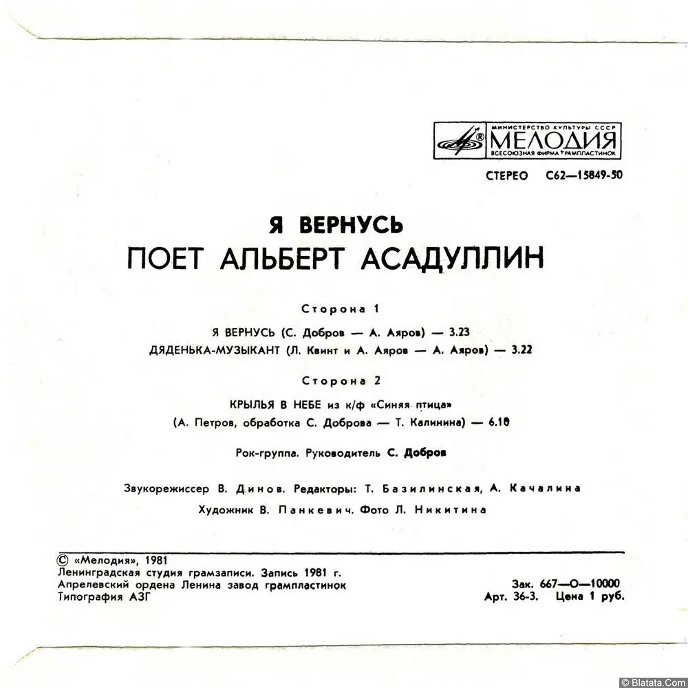 В 1981 году на советском виниле был выпущен миньон «Я вернусь», который стал знаковым релизом в карьере одного из самых любимых исполнителей 70-х и 80-х годов, Альберта Асадуллина. Этот миньон включает в себя как вокальные композиции, так и музыкальные произведения, ставшие своеобразными символами того времени. Его исполнения в сочетании с авторскими аранжировками и мелодиями олицетворяют типичный для советской эстрады стиль, наполненный эмоциональной выразительностью и искренностью.
