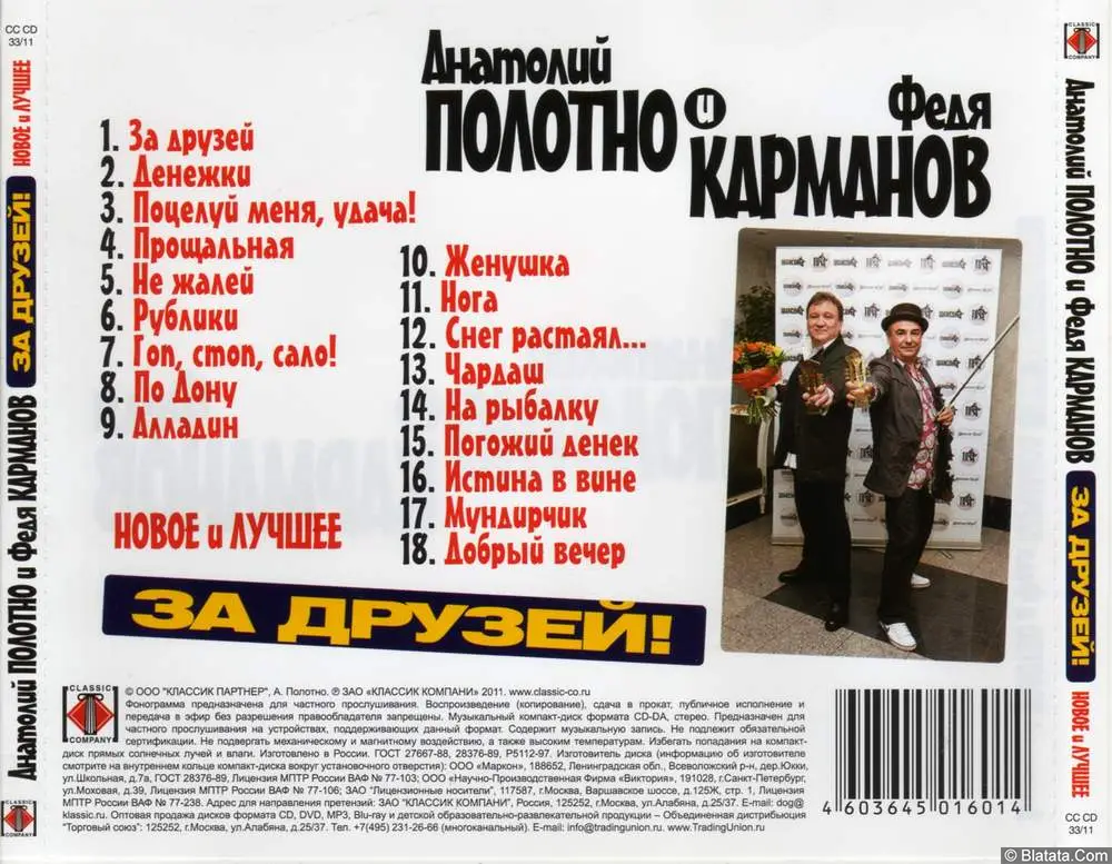 Компакт-диск Анатолия Полотна и Феди Карманова «За друзей», выпущенный в 2011 году, является ярким примером современного русскоязычного музыкального творчества, которое сочетает в себе элементы народной, поп и эстрадной музыки. Альбом состоит из 18 треков, каждый из которых наполняет слушателя уникальными эмоциями и настроениями.