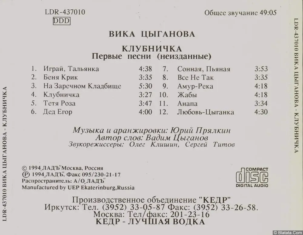 Альбом «Клубничка» (1993) Вики Цыгановой продолжает её путь в жанре русского шансона, исследуя разнообразие человеческих переживаний, тем любви и боли, а также нелёгкую судьбу. В этом релизе слушатель встретит целый спектр эмоций — от лиричных, наполненных любовью песен до более жестких и уличных мотивов, характерных для шансонной культуры того времени. Этот альбом можно воспринимать как ещё одну веху в развитии артистки, где она пытается сочетать мягкие и сильные моменты, характерные для её стиля.