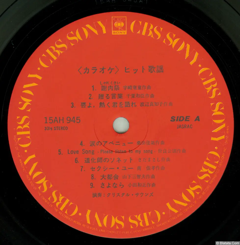 Японская виниловая пластинка из популярной бюджетной серии Golden Special 1500, предназначенной для массового рынка и караоке-использования. Альбом включает 18 хитов японской эстрады (kayōkyoku) в инструментальных версиях ансамбля Crystal Sounds — с чёткой ритмикой, подчёркнутой мелодической линией и удобной тональностью для пения.