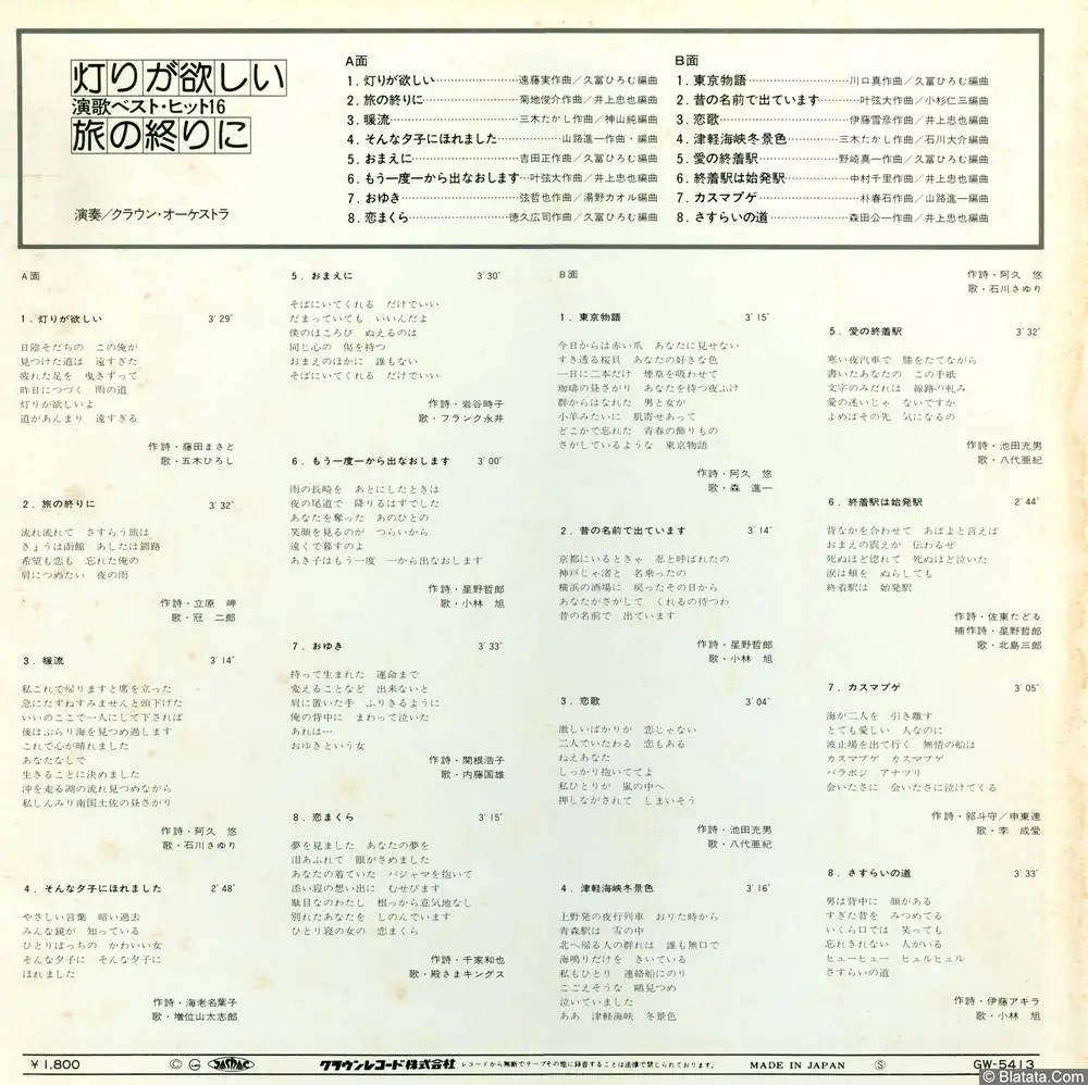 灯りが欲しい/旅の終りに — японская виниловая компиляция в жанре enka / kayōkyoku, изданная лейблом Crown Record. Сборник объединяет популярные эстрадные и драматические песни о дороге, расставаниях, любви и одиночестве — характерные темы японской песенной традиции 1970-х годов.
