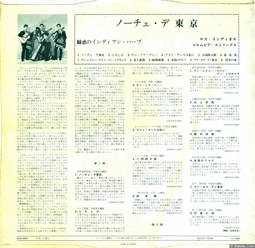 ノーチェ・デ・東京 — японская виниловая пластинка в жанре latin / easy listening / world music, посвящённая экзотическому звучанию индейской арфы и латиноамериканских мотивов. Альбом объединяет атмосферные инструментальные композиции, навеянные ночным Токио, дорогами, танцами и романтикой дальних стран.