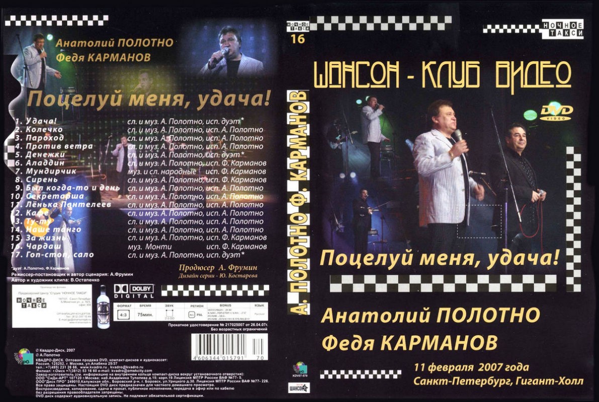 Представляем вам музыкальный альбом Анатолий Полотно, Федя Карманов «Поцелуй меня, удача!» 2007 (DVD), выходивший в формате DVD диски, а также возможно еще выйдет или выходил на других носителях. Вас заинтересует издание Анатолий Полотно, Федя Карманов «Поцелуй меня, удача!» 2007 (DVD), если с интересом относитесь к следующим исполнителям.